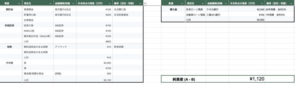 『資産』と『負債』のリストアップが完了すると、こんな感じになります